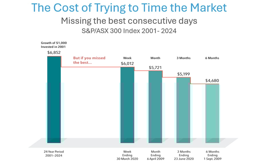 An investment of $1000 into the S&P/ASX 300 Index made at the beginning of 2001 turns into $6,852 for the 24-year period ending 31 December 2024. Miss the S&P/ASX 300’s best week, and the value shrinks to $6,012. Miss the best three months, and the total return falls to $5,199.