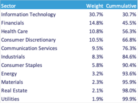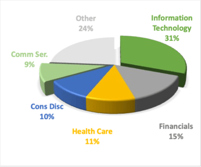 Five sectors make up approximately 75% of the US market, with Tech companies constituting around 40%. The bottom chart shows the 12-month performance of the five largest sectors.